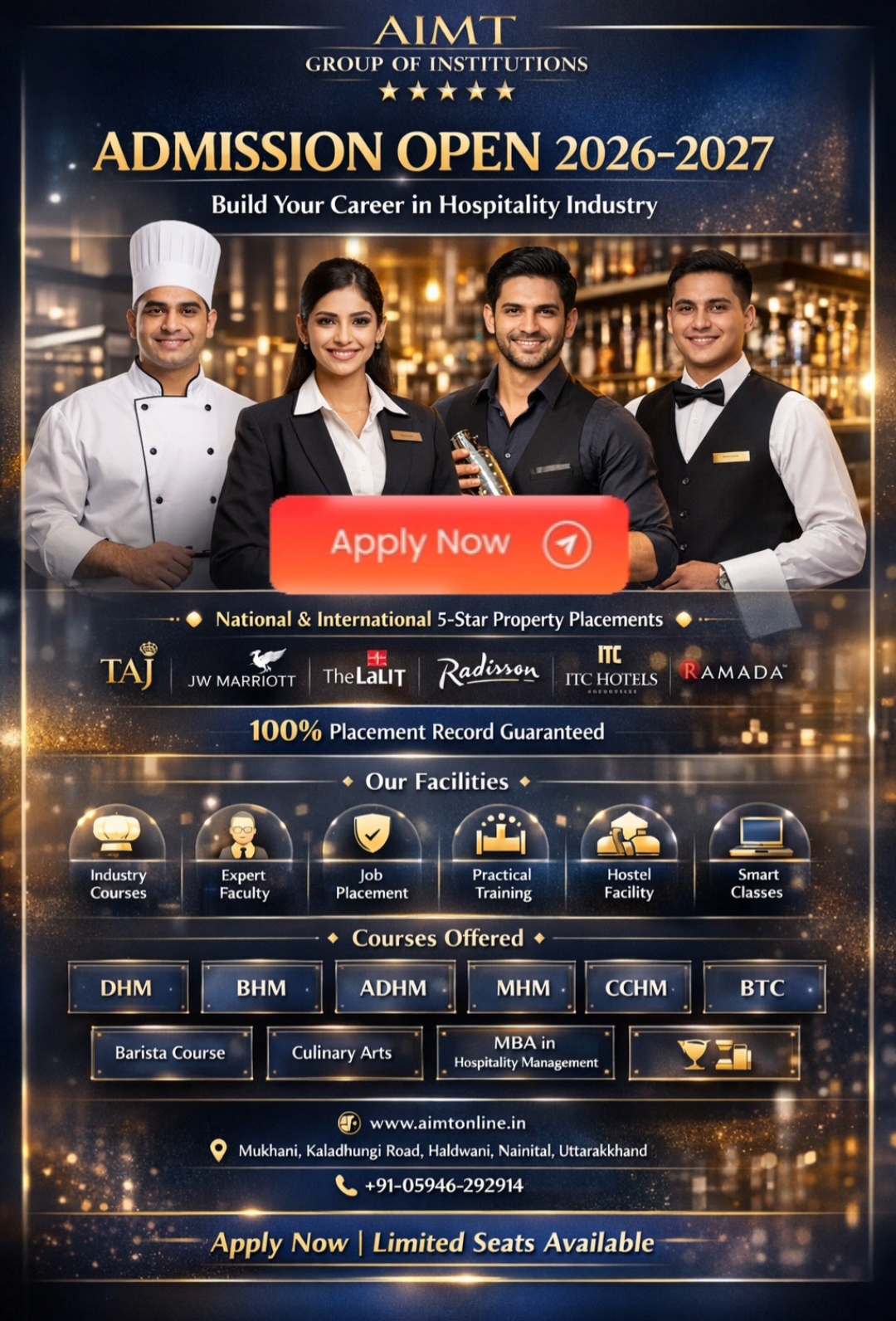 I had a great experience with AIMT, Nainital. The institute is well-known for its quality education in Hotel Management and offers a wide range of courses including undergraduate, postgraduate, diploma, and certificate programs. The NAAC A++ accreditation and ISO certification clearly reflect the institution’s commitment to maintaining high academic and professional standards. The faculty members are knowledgeable, supportive, and focus on both theoretical and practical learning, which is very important in the hospitality industry. The campus environment is positive and helps in overall personality development. The curriculum is well-structured and aligned with industry requirements, making students job-ready. Overall, AIMT is a good choice for students who are looking to build a career in Hotel Management.